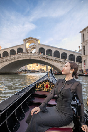 Woman having a Gondola ride with the view of rialto bridge at grand canal in venice, italy.