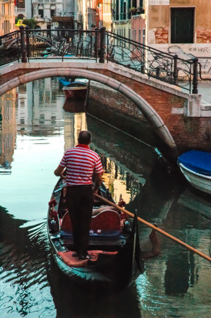 Venice, Italy, September 4, 2018. View of the canal, the Venetian landscape with boats and gondolas. The actor sings in a boat under the accordion.