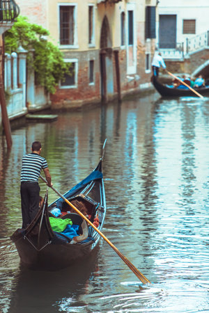 Venice, Italy - May 10, 2019: Venetian gondolier punts gondola through narrow canal waters of Venice Italy