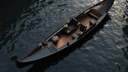 A stunning gondola floats gracefully on calm water, featuring luxurious seating and beautiful cushions for an exquisite experience of leisure and travel.