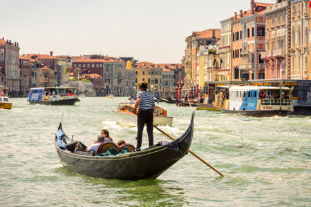 Venice, Italy - May 18, 2017: Gondola and other tourist boats are sailing along the Grand Canal. Grand Canal is one of the major water-traffic corridors in Venice.