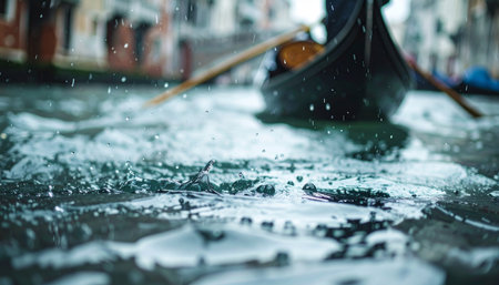 A captivating close-up of water droplets splashing around a gondola, capturing the essence of movement and life on the canals. Ai-Generated