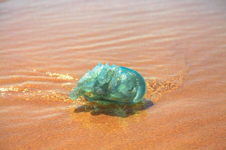 Closeup of blue jellyfish species Velella jellyfish, stranded on the sand in Gold Coast of Queensland on Australian beach.