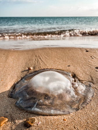 Close-up of cornerot and aurelia jellyfish on the sandy shore and in the water. Ecological catastrophe. Threat to humans. The invasion of jellyfish in the sea. Rhizostoma pulmo and Aurelia aurita