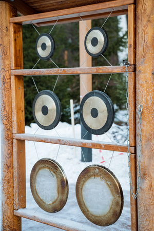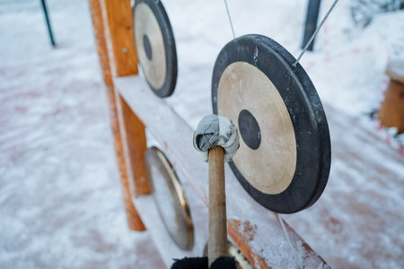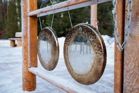 Three gongs made of metal and beautifully crafted are hanging gracefully on a sturdy wooden shelf that is situated in the cold, soft snow, creating a picturesque winter scene