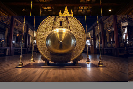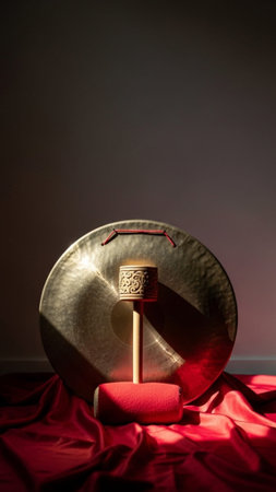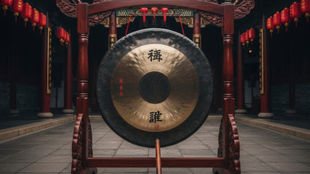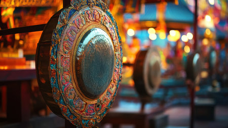 A beautifully adorned traditional gong in a colorful festival setting, bringing warmth through its intricate design and soft lighting, evoking cultural celebration and festive spirits.