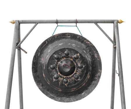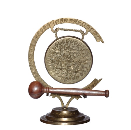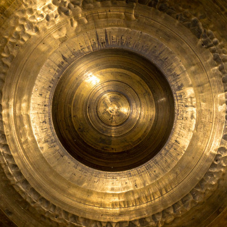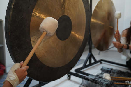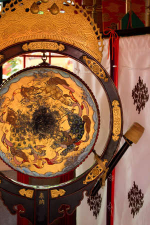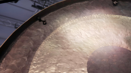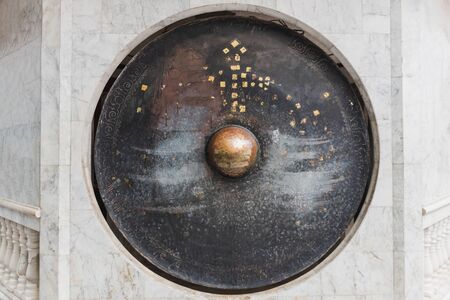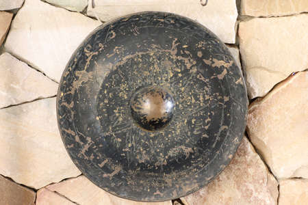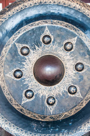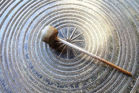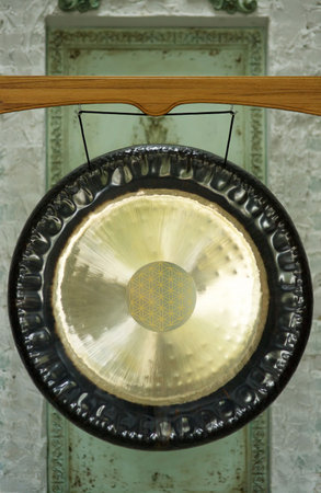 Close up of a big oriental metal musical instrument called, Gong, used for relaxation music and buddhists.