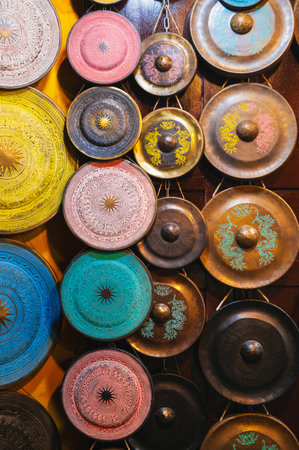 The gongs hanging on the wall are traditional Asian musical instruments at the street market.