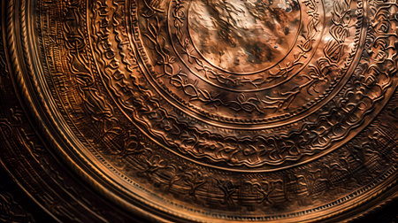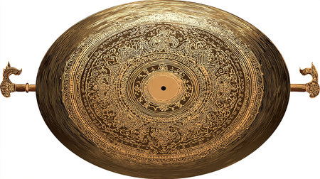 A detailed, symmetrical close-up of a large, traditional bronze gong. The surface is adorned with intricate, engraved floral patterns typical of Southeast Asian art, with a central, polished boss that reflects a warm light, representing tradition, music, and spirituality.