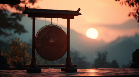 A serene image of a traditional gong silhouetted against a glowing sunrise in a misty mountain landscape, evoking peace, meditation, and cultural heritage.