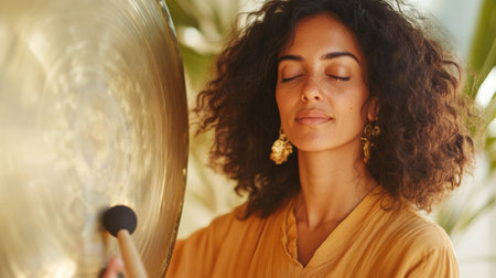 Serene Woman with Gong Engaged in Meditation and Sound Therapy.