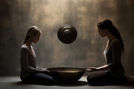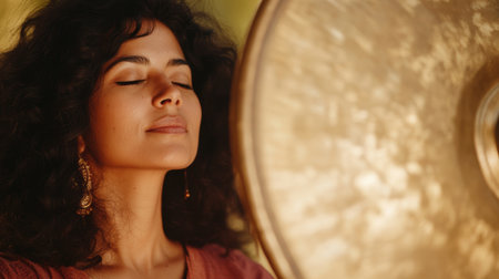 Gong Resonance Therapy: A woman immersed in the therapeutic sounds of gongs, promoting mental well-being and enhancing sleep quality