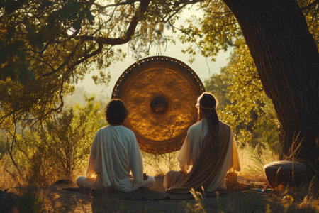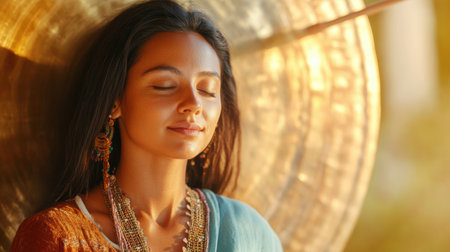 Tranquil Woman Meditating with Golden Gong in Peaceful Setting.