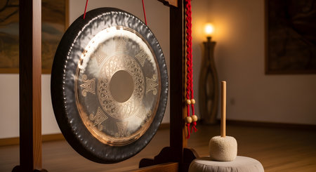 A large bronze Chau gong with intricate etchings hangs on a wooden stand in a serene room, ready for a sound bath or meditation session. A mallet rests nearby, creating an atmosphere of peace and spirituality.
