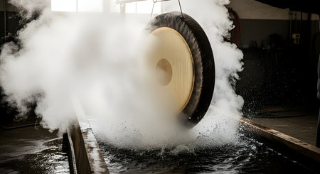 A large, traditional gong is being lowered into a trough of water, creating a massive cloud of steam and splashes. This represents the final stage of forging or 'quenching' the metal instrument in a workshop. This image captures a dramatic manufacturing process.