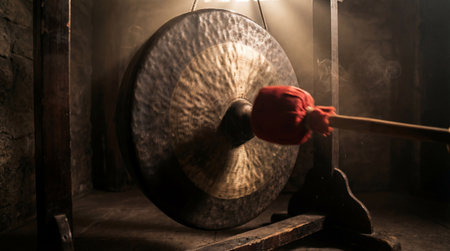 A large, dark bronze gong is struck by a red mallet, creating a powerful impact. Dramatic light illuminates the hazy atmosphere, highlighting swirling dust.