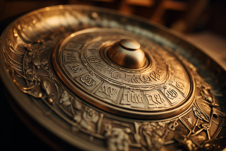 A close-up of a detailed bronze shield featuring intricate engravings, symbols, and figures, highlighted by soft lighting.