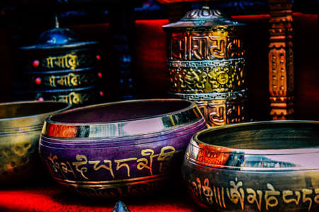 Kathmandu Nepal August 22, 2018 Closeup of Tibetan bowl sold in a souvenir shop at Thamel street in Kathmandu in the morning