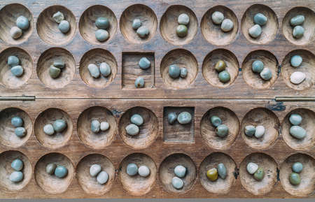 Antique Boa Mancala tradition African Board Game. Vintage Bao carved wooden Board Game. With natural baobab tree seeds Balls.