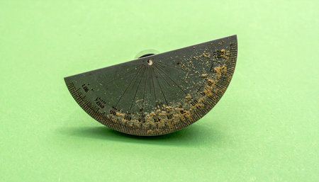 This image features a vintage metal measuring tool resting on a textured green surface, showcasing rust stains and patina details, conveying a sense of industrial history.
