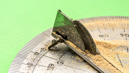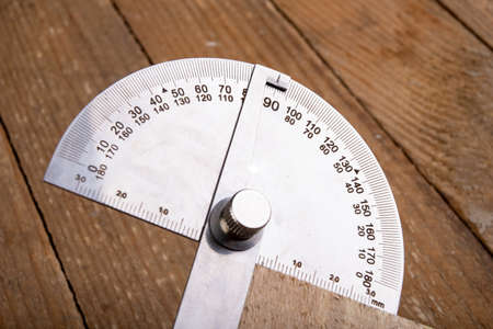 Metal protractor for measuring in carpentry. Minor work in a home workshop. Place of work back.