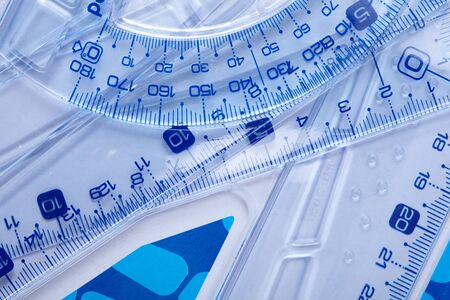 transparent rulers, protractor and compasses on blue surface