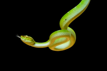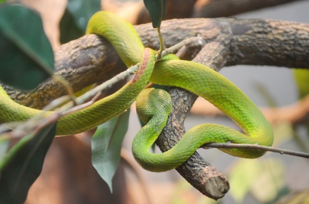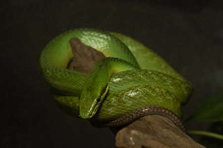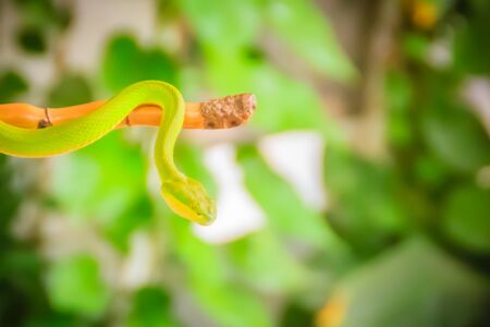 Scary green venomous pit viper is crawling on the branch. Green pit viper snake (Trimeresurus) also known as Asian palm pit vipers, Asian lanceheads and Asian lance-headed vipers.