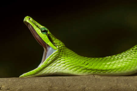 Vibrant green snake displaying its open mouth in a natural habitat during daylight