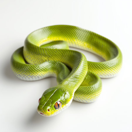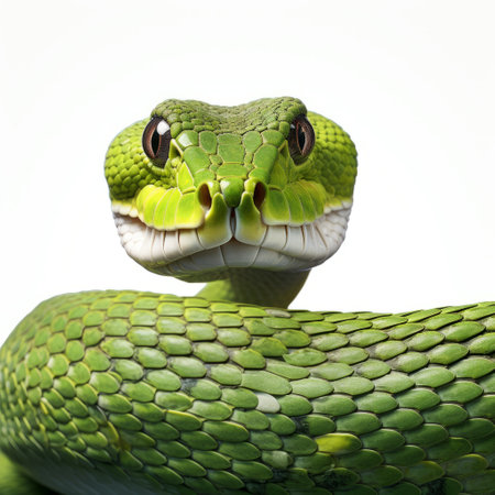 a green snake with its mouth wide open is captured in this photo. the image showcases photorealistic detailing and minimal retouching, with a white background. rendered in maya using photo-realistic techniques, this eye-catching and realistic depiction of the snake is sure to captivate viewers. ai generated