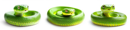 Closeup of bright green snake with detailed scales, coiled and resting, isolated on white transparent background, reptiles or wildlife, symbolizing Chinese Lunar New year