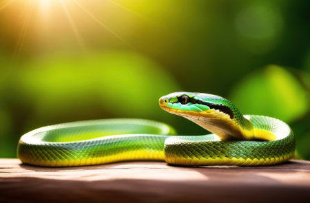 Experience the stunning beauty of this vibrant green snake basking in the golden sunlight. Symbol of 2025 year. Perfect for nature enthusiasts and wildlife lovers. Generated A.I.