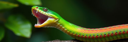 Colorful snake with vibrant scales open mouth resting on a branch in a lush rainforest