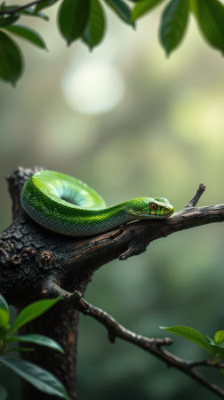 A vibrant green snake is coiled elegantly on a mossy branch, surrounded by rich foliage in a tropical forest. Sunlight filters through the leaves, creating a serene atmosphere.