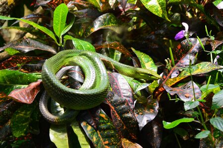 Green snake resting among lush foliage in a tropical rainforest during daylight