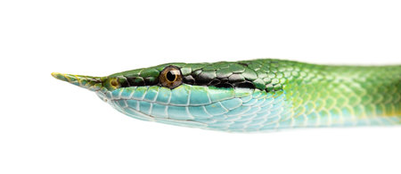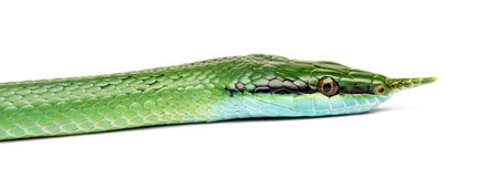 Gonyosoma oxycephalum, the arboreal ratsnake, the red-tailed green ratsnake, and the red-tailed racer, isolated on white background.