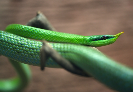 Gonyosoma oxycephalum, the arboreal ratsnake, the red-tailed green ratsnake, and the red-tailed racer