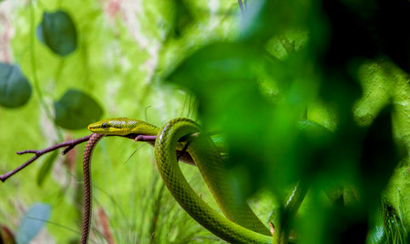 An elegant green vine snake Ahaetulla nasuta curls around a branch behind lush leaves in a tranquil terrarium as it reveals cryptic camouflage and a watchful gaze