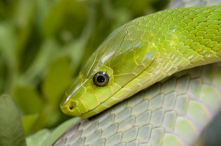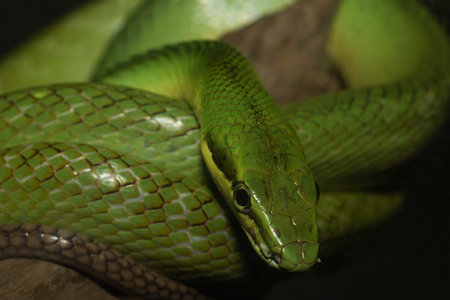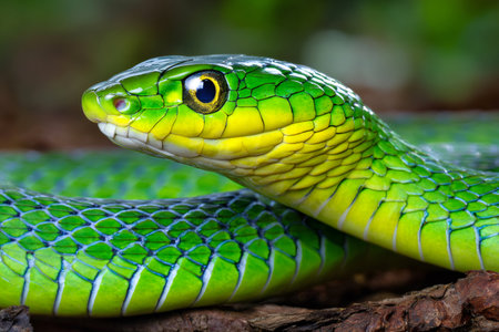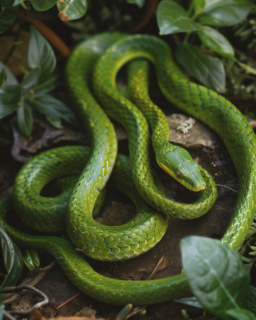 Close-up of a vibrant green snake resting in its natural habitat during daylight hours