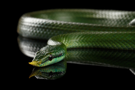 Green long nosed snake, Rhinoceros Ratsnake isolated on black background with reflection
