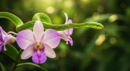 Green snake and purple orchid flower on blurred nature background with bokeh.