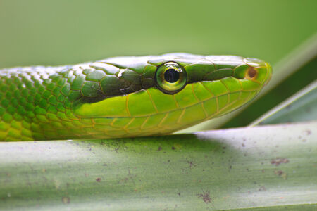 closeup of the face of a red tailed green ratsnake, tropical reptile specie from Asia