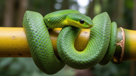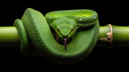 A vivid green snake is coiled around a bamboo branch, its scales catching the light. The image showcases the snake against a deep black backdrop, emphasizing its vibrant color. The composition suggests an isolated environment, suitable for various editorial and commercial applications. The close-up perspective highlights the texture and detail.