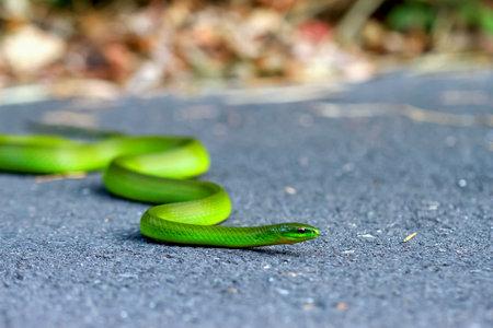 Green snake with distinctive features observed in a natural environment during daylight hours