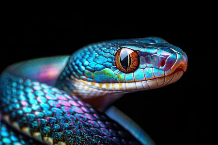 Close-up of a colorful snake with iridescent scales, showcasing intricate patterns and textures against a dark background. Nature and wildlife concept.