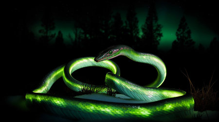 An AI generated illustration of a vibrant, illuminated snake on a blurred, dark background