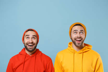 Two smiling hipster men guys in fashion red yellow clothes posing isolated on pastel blue background studio portrait. People sincere emotions lifestyle concept. Mock up copy space. Looking camera.