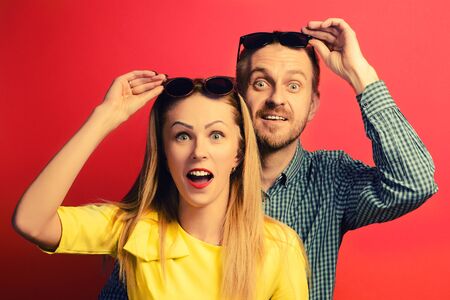 Wow. Surprised man and woman in glasses with open mouth an embrace on a red background