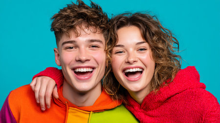 A close-up shot of a happy couple, showcasing their joyous expressions and fashionable accessories, perfect for capturing a moment of fun and connection at a party.