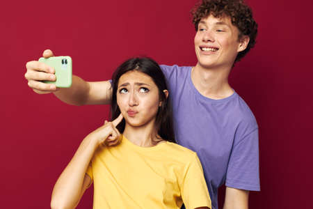 portrait of young happy positive optimistic loving couple posing isolated over purple background
