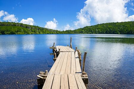 Shiretoko Goko Five Lakes in Shiretoko National Park. Rolling mountain range and wetland in high latitude country springtime. Tourists can walk on the elevated wooden boardwalk. Shari, Hokkaido, Japan